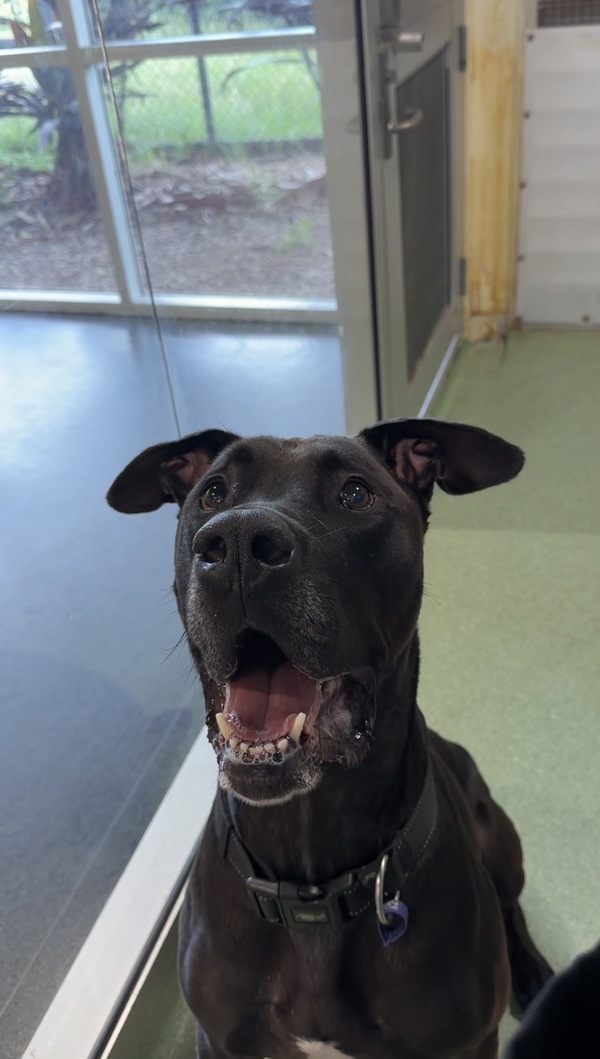 Frankie is a big, love‑soaked goofball wrapped in a mature dog body with a puppy heart. He adores being glued to his humans, leaning his whole giant self into you for affection, and - yes - trying to sneak onto your bed at night (he can settle if the bedroom door is closed!). He's also a professional couch‑hog, drool‑rag model, and enthusiastic water‑splasher. Frankie can be quite stressed and drooly when first in the home, a drool rag comes in handy for that settling in period.