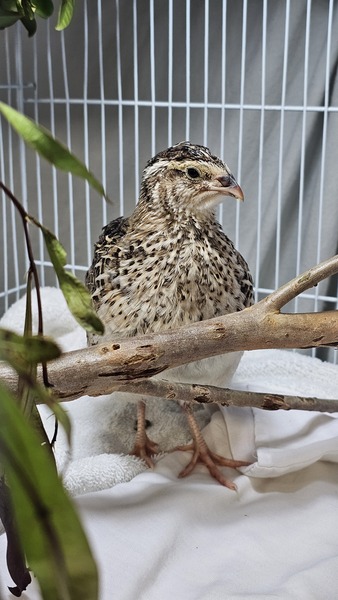Alexa is a darling little quail with a gentle nature and a curious sparkle in her eyes. She loves watching the world around her and brings a soft, calming presence wherever she goes. She'd thrive in a secure predator-proof yard pen with plenty of space to roam, ability to be protected from the elements, some loose dirt available for dust-bathing, and low shelters or plants to help her feel safe. Because Japanese quail can jump surprisingly high - often straight up several feet if startled - it's ideal for her enclosure to be netted in. She'd also enjoy the company of other mellow quail and caregivers who keep her environment peaceful and predictable.
