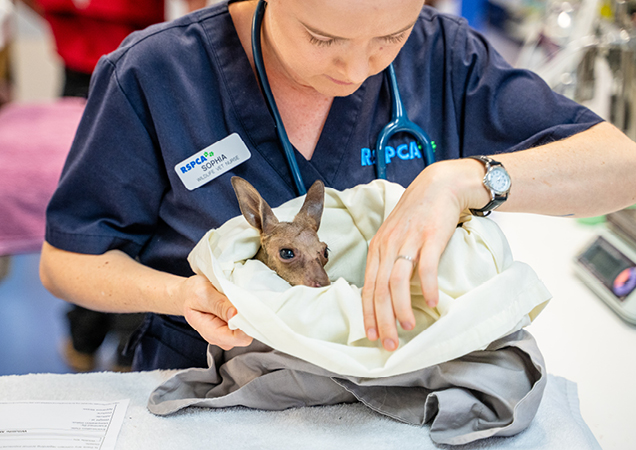 Marsupials like this eastern grey wallaby joey often find themselves orphaned due to vehicle strikes. Her mother had been hit by a car in Logan and sadly didn’t survive. But this little one is now thriving in RSPCA care and slowly healing from her injuries sustained. Thanks to someone calling our 1300 ANIMAL hotline and alerting our Rescue Team, this little one could be saved.